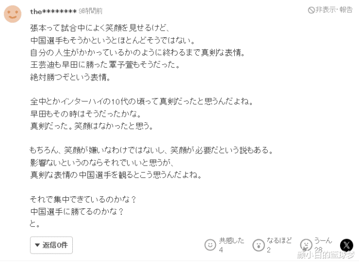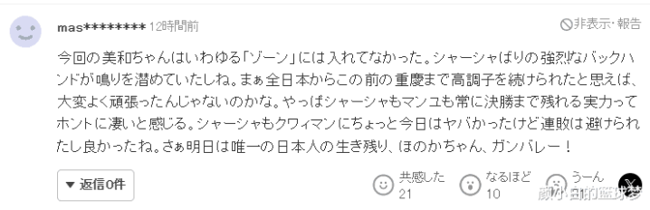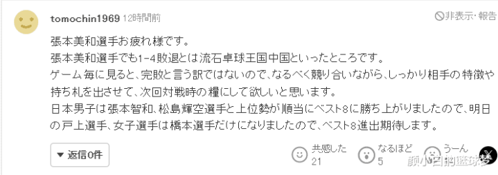 日本球迷热议张本美和无缘世界杯八强:1.美和这次没有进入所谓的‘Zone’,她的反手击球没有力量,想想从全日本锦标赛到重庆冠军赛,她是不是真的保持专注了?