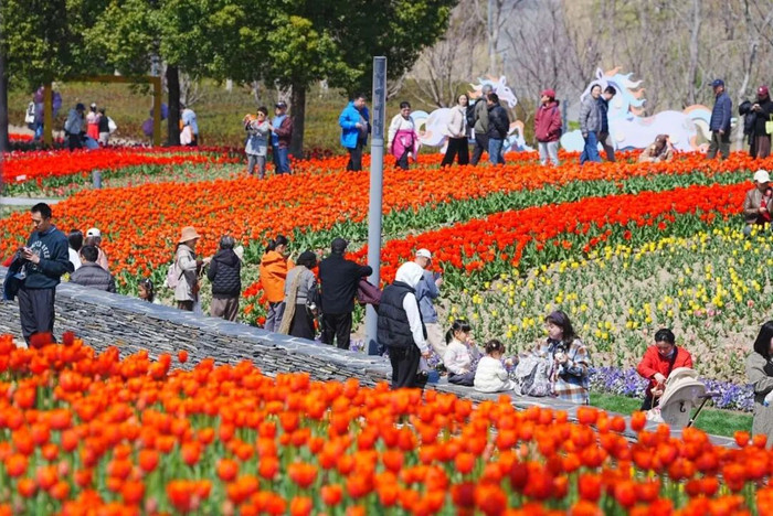 恰逢春日,TOP中央公园内14000平方米的立体郁金香花海缤纷开放,18个品种的郁金香色彩斑斓,沿着起伏的山谷地形层层铺展。赛事期间,主办方开放的免费观赛预约通道十分火爆,大批市民前来感受冰壶运动的魅力,不少观众观赛后都会漫步公园赏景,轻松实现“观赛+踏青”的一站式休闲体验。据区绿容局统计,今年3月累计客流量达30万,较2月增长3倍,周末单日峰值可达3万人。